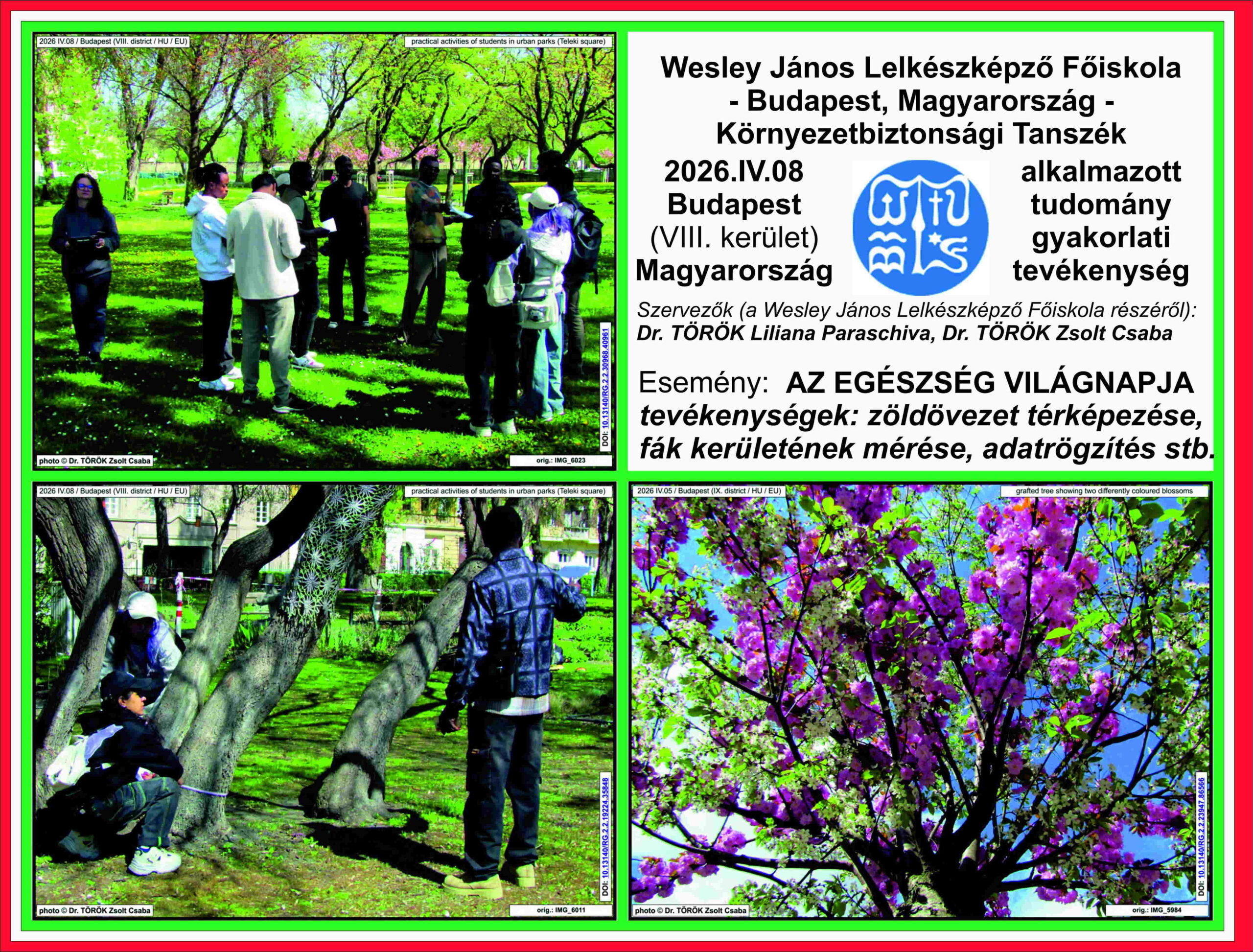 Az Egészség Világnapja alkalmával a Wesley János Lelkészképző Főiskola II. éves, nemzetközi hallgatói tanulmányozták (a Környezetbiztonsági Tanszék munkatársai – Dr. Török Liliana és Dr. Török Zsolt egyetemi oktatók- vezetésével) egy nagyvárosi zöldövezet emberi egészségre gyakorolt közvetett hatását. A gyakorlati tevékenységre a, Budapest VIII. kerületében lévő, Teleki-téri parkban került sor. Ez alkalommal a fajmeghatározást követően a fák törzsén végzett mérések alapján megállapításra került a fák kora és tömege. Az adatokból a fák által lekötött szénmennyiséget és a város levegőjéből eltávolított szén-dioxid mennyiségét is ki lehetett számítani.